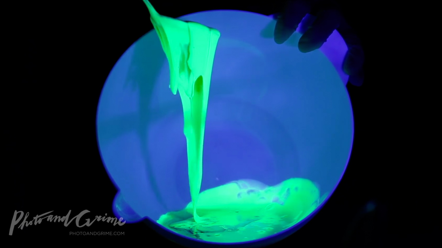 Estimate how much slime you want, and add about half the amount of glue in a bowl. Add your favourite colour UV face paint, mix, and then slowly add some detergent. Mix your ingredients well, slowly adding a spoonful of detergent every time. While mixing the detergent with the glue and face paint, you go through different stages of glue. Above you can see the most sticky kind.