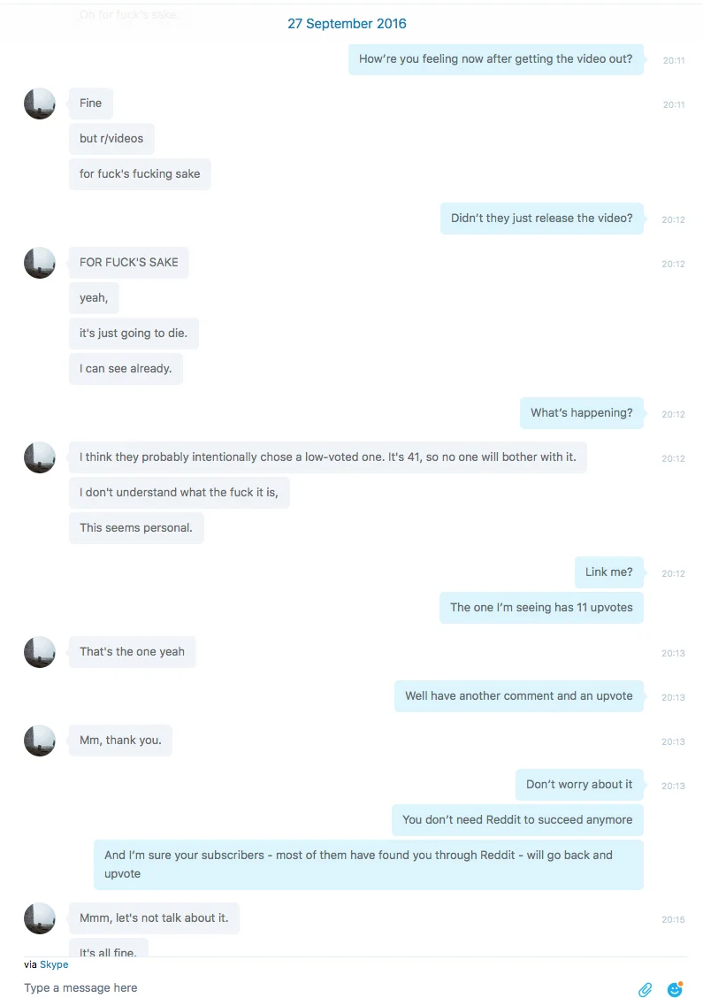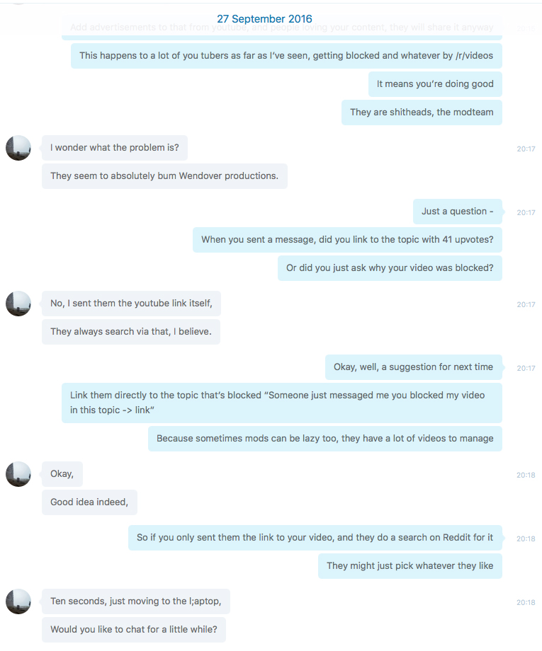 Back to Exurb1a. Exurb1a was obsessed with /r/videos. When he gained a lot of followers, and no longer needed to self-promote his work using his own accounts or alt-accounts and other techniques, he relied on his followers and friends to share his content. Because /r/videos regularly blocked his videos or when they got caught in his spamfilter, his friends and I helped him to get his videos out of there. In the conversation below I reminded him of the (hidden) rules. He seems 'unaware' of the policies /r/videos has in this conversation. I originally thought his reaction was a bit strange, since months before he admitted he knew about them and found ways around it.