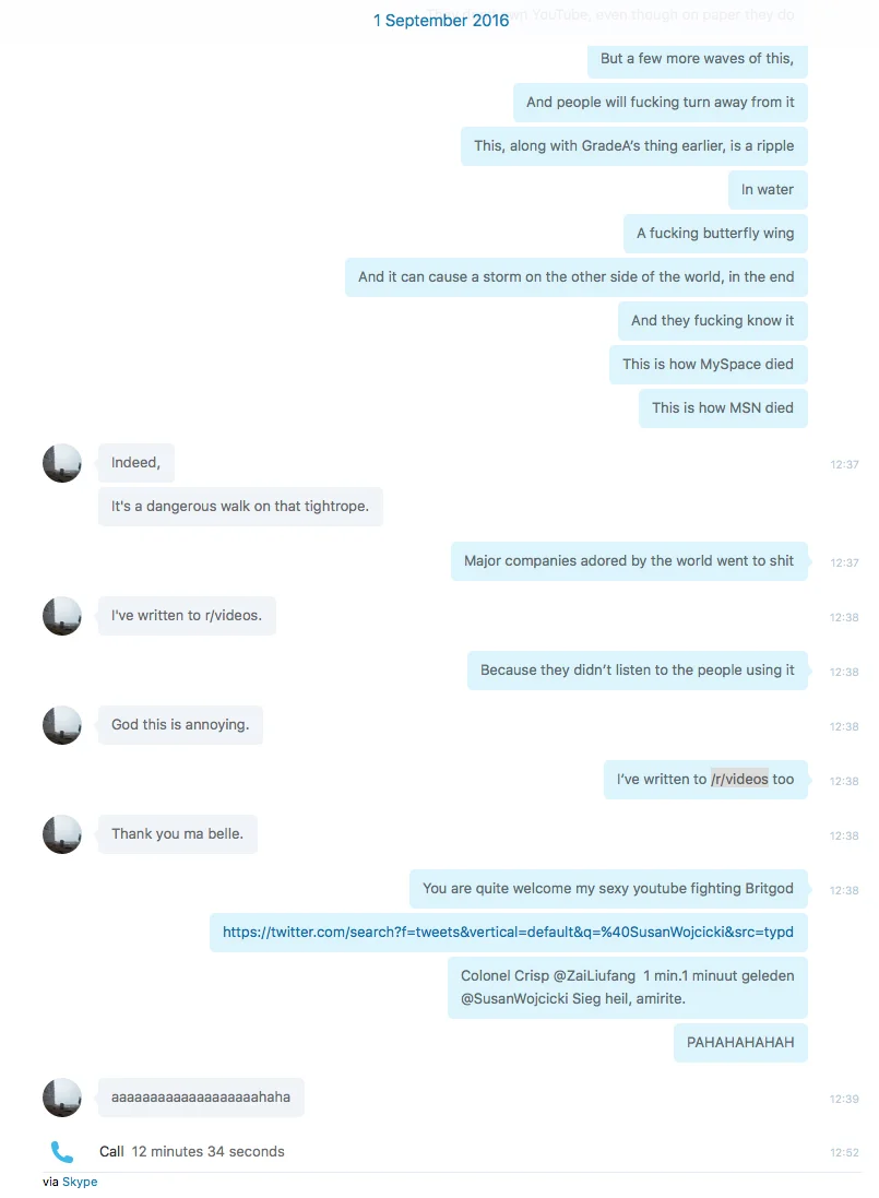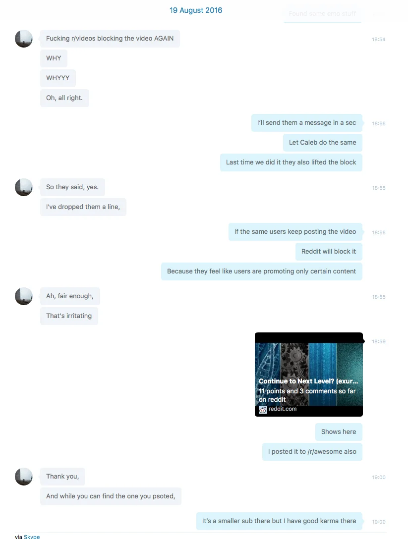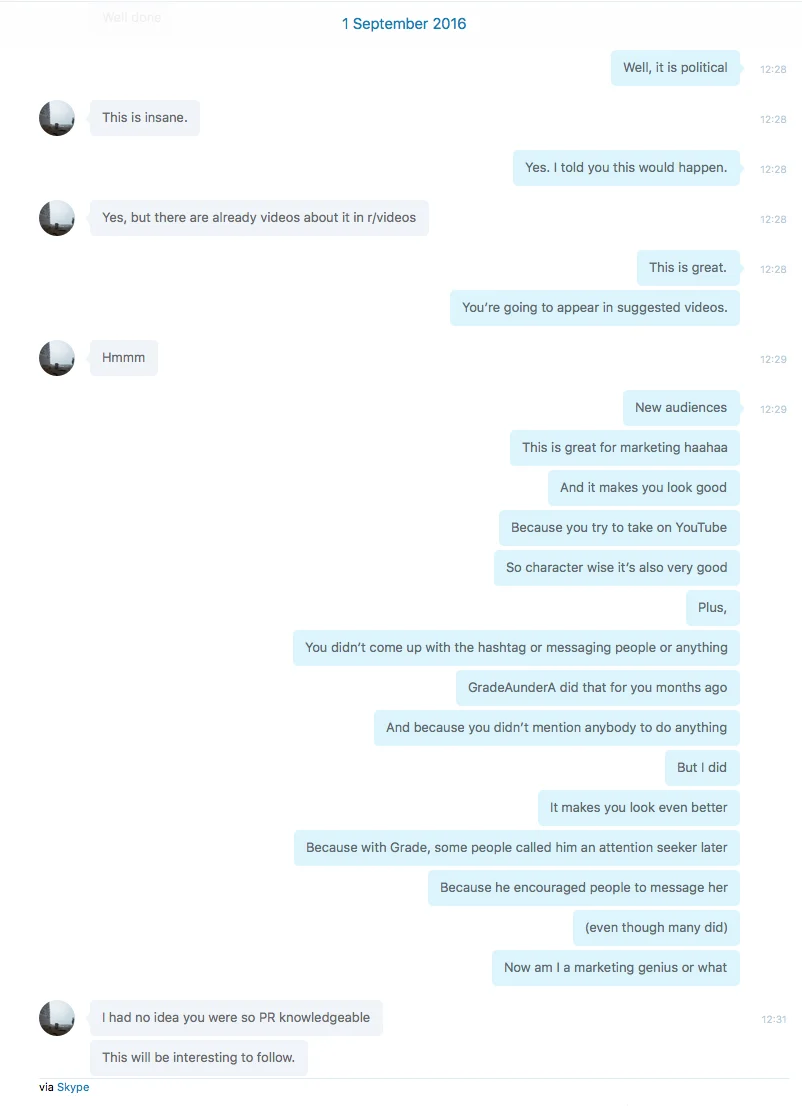“If you want evidence these Skype conversations are between Exurb1a and I, you can find it at my subscribers only page.”