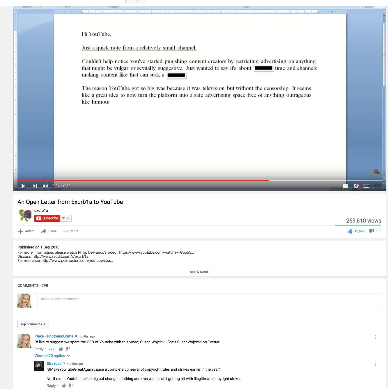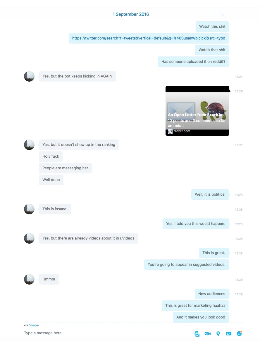 Back to the conversation. In the conversation, we're specifically talking about pr strategies, and a comment I left on his video, to encourage people to speak out against youtube's CEO Susan Wojcicki, which many people started to do.