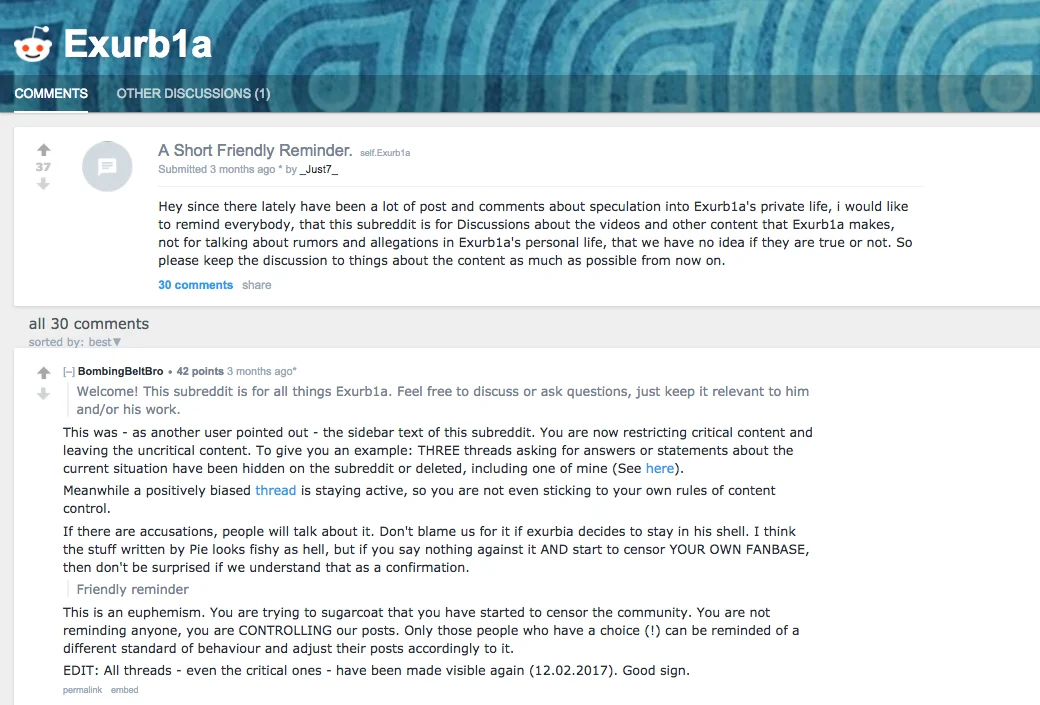 Exurb1a both hated and loved /r/videos. They helped him gain more exposure and make more money. However, they regularly blocked his content, which made him angry and insecure.