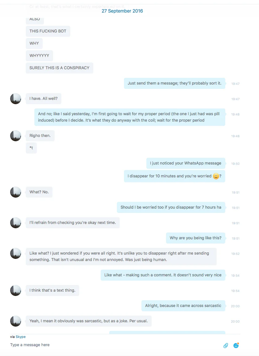 Side-note: The above conversation was only 3 weeks before the drunk night happened, during which Exurb1a physically and sexually abused me. In it we're also talking about me getting off the birth control pill. I went off it because it affected me quite bad mentally (as a result I went on anti anxiety medication because I started getting panic attacks after being on the pill for 2 weeks, something I never experienced in my life before), and we'd been talking about me going on the coil instead. Exurb1a was quite pushy about this. In this conversation you can also notice how in general he treated me often. Side-note, I got pregnant apparently around this time when I went off the birth-control pill, which resulted in a miscarriage. The day after the miscarriage I was hospitalised for depression: a result of everything that happened between Exurb1a and I, going on and off the birth control pill, and most likely hormones. Exurb1a blackmailed me after this, while I was hospitalised.