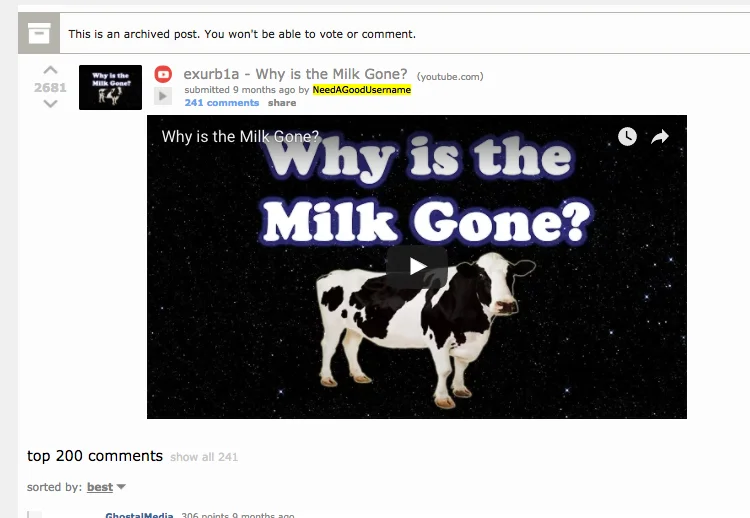 I'm not the first one pointing this out though. In /r/karmacourt, NeedAGoodUsername has been accused of submitting content by Exurb1a in order to gain karma (the magical invisible internetpoints you can receive at reddit when your comments or threads are upvoted, but you can't pay your breakfast with).