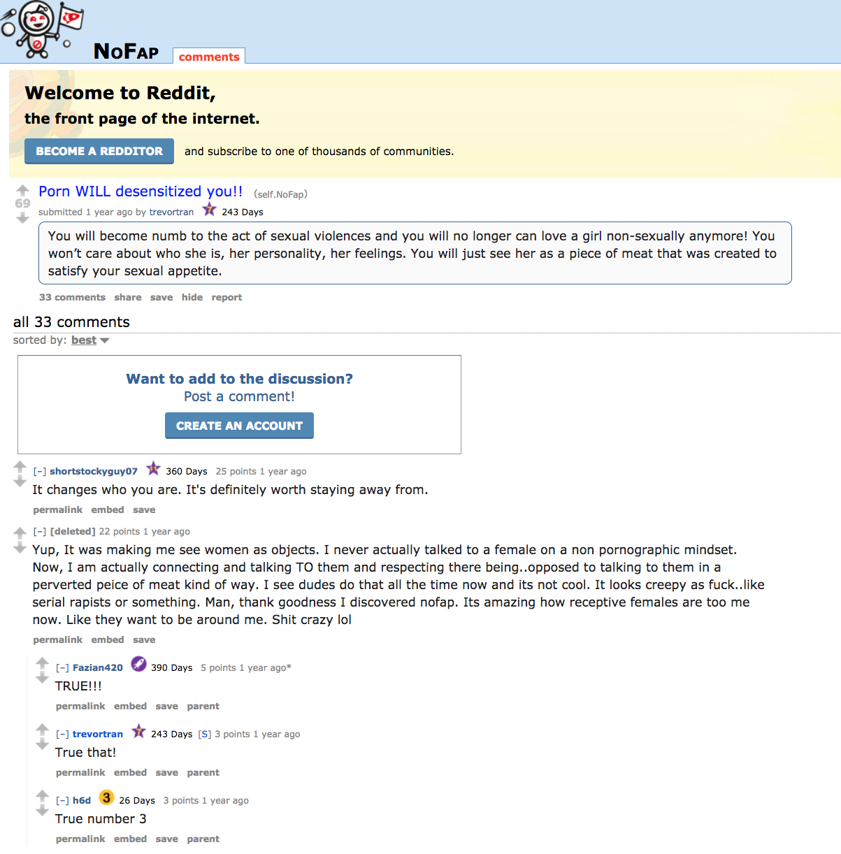 If you do a quick Google search on the keywords desensitized to porn, chances are you will find Google is linking to Reddit on the first page. One of the threads they are linking to, is a subreddit called NoFap, which encourages people not to masturbate for a certain time. It’s mostly used by men.