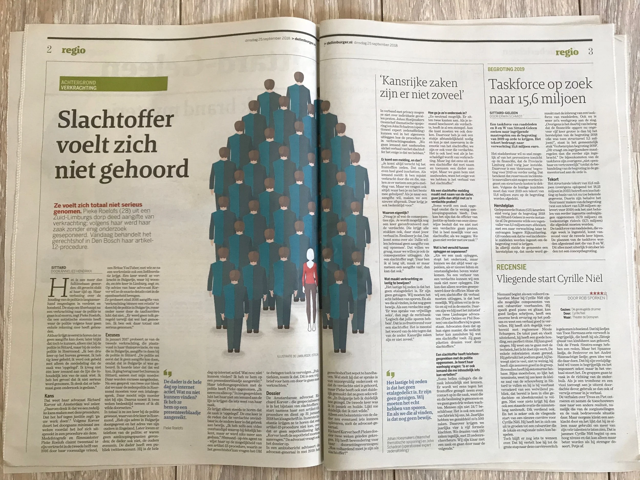 Then, in July 2019, Dutch newspaper De Gelderlander published an opinion article of Pie after she attended the rape court case of 3 victims. Pie attended the hearing after the father of one of the victims got in touch with her after reading about her experiences in the news. Pie criticised the treatment of ‘Jane Gelderland’ (Gelderland referencing the province where the case took place) and the 2 other victims: Jane Gelderland wasn’t taken serious when she reported her rape. Subsequently, the offender victimised two other girls. Only after 3 girls reported the same man, the Dutch government decided to prosecute him.